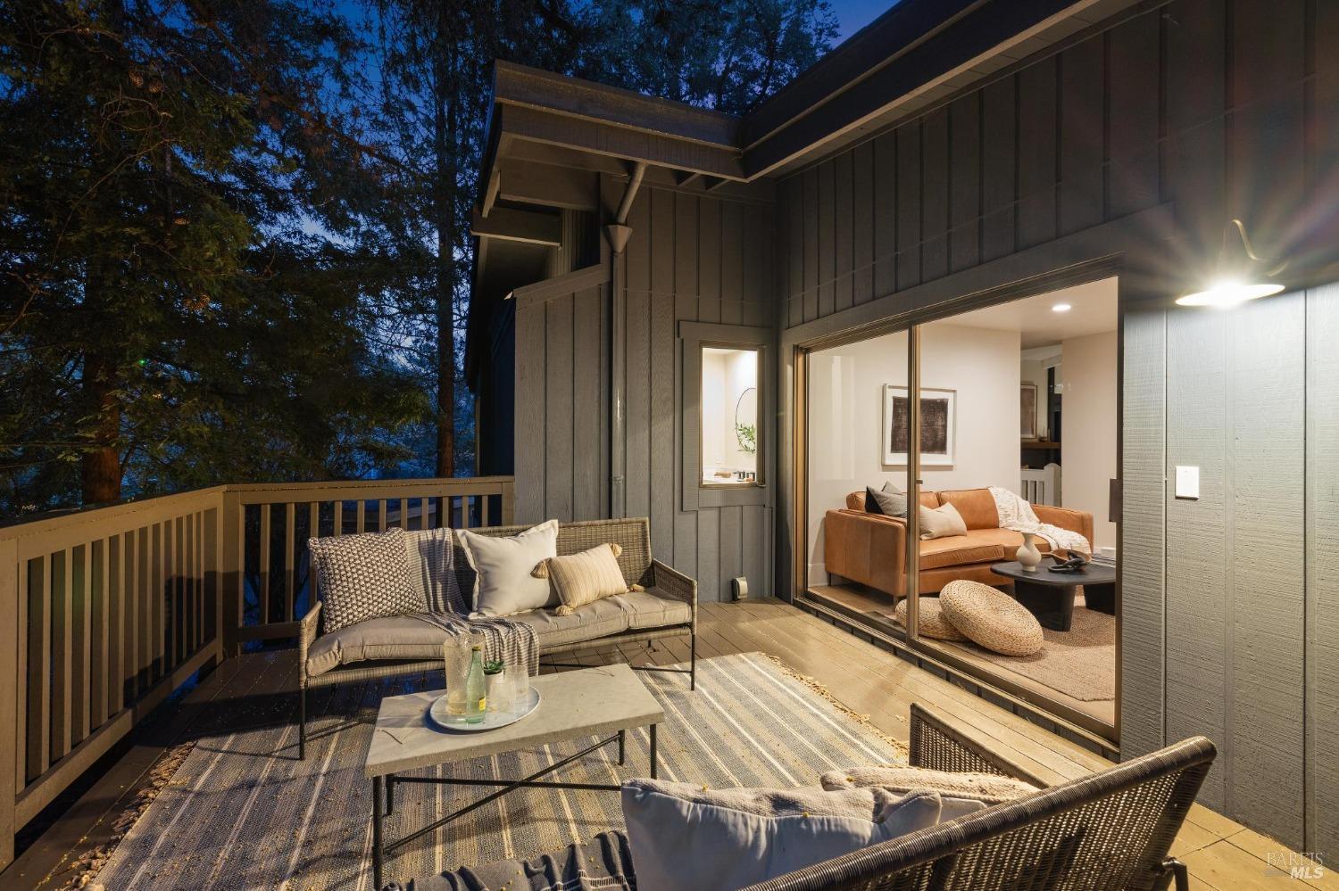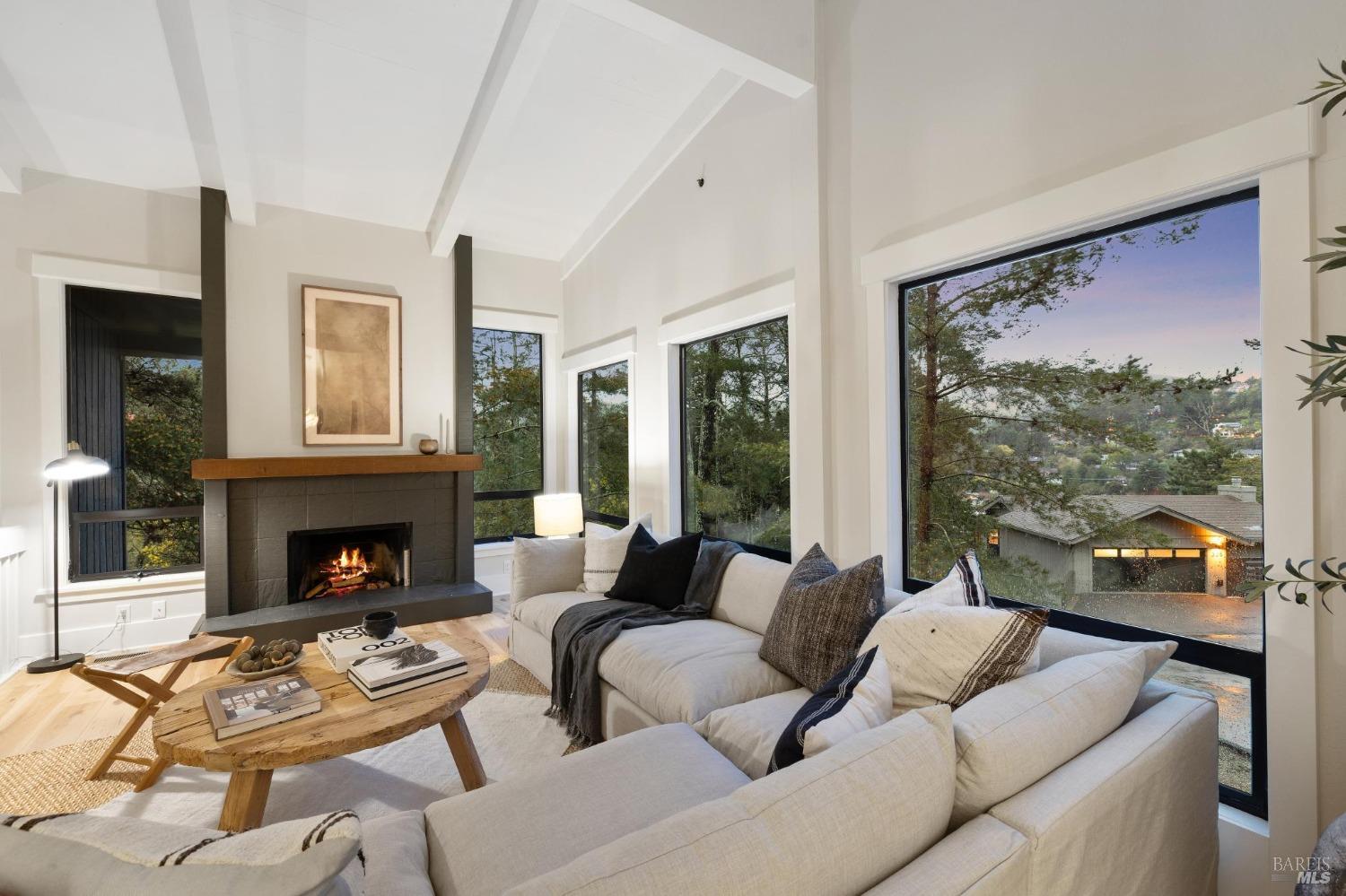 Quintessential Mill Valley living in this recently updated residence. The heart of the home is a large, open-concept living & dining room w/ high beamed ceilings. Bathed in natural light w/ stunning views of the surrounding hills & trees, the great room flows seamlessly to the first of two decks & recently renovated kitchen, which boasts two-toned cabinetry, glacier-hued countertops & backsplash, brand new stainless steel appls, a charming breakfast nook & direct access to the back deck. Vast primary suite features walk-in closet & fully renovated bathroom w/ walk-in shower & skylight beneath the trees. A chic/convenient powder room for your guests completes this level. 2 additional bedrooms, completely updated full bathroom & office space downstairs. New flooring & light fixtures. Laundry area. Two-car attached garage w/EV charger. Extra driveway parking. This peaceful retreat is perfectly nestled amongst the redwoods, but just moments to all the amenities of lively Tam Junction: Equator Coffee, PizzaHacker + live music and comedy at The Junction Beer Garden, Hook Fish Co at Proof Lab Beer Garden, Good Earth Market. Easy access to award-winning schools, world-class hiking, biking and beaches. Commuter's delight: as little as 15 mins to San Francisco